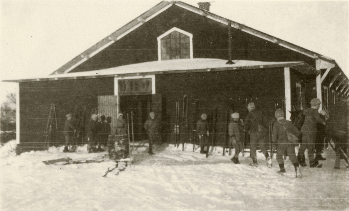 Text i fotoalbum: "De härliga veckorna i Björnänge togo slut och så började en ansträngande vecka i Östersundstrakten där vi deltog i den stora vintermanövren. Sista förläggningen i Frösö läger - och sedan bar det hem till Karlsborg igen".