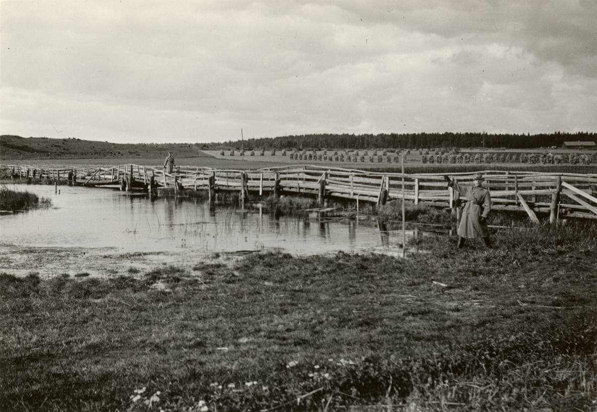 Text i fotoalbum: "Brobyggnad i Storvreta under mötet 1931. Här ska bron gå!".