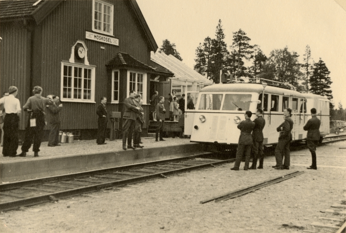 Text i fotoalbum: "16. juli 1938 startade hfk (högre fortifikationskurs) en långresa med inlandsbanan från Östersund till Gellivare. Vår trogna rälsbuss vilar sig."
