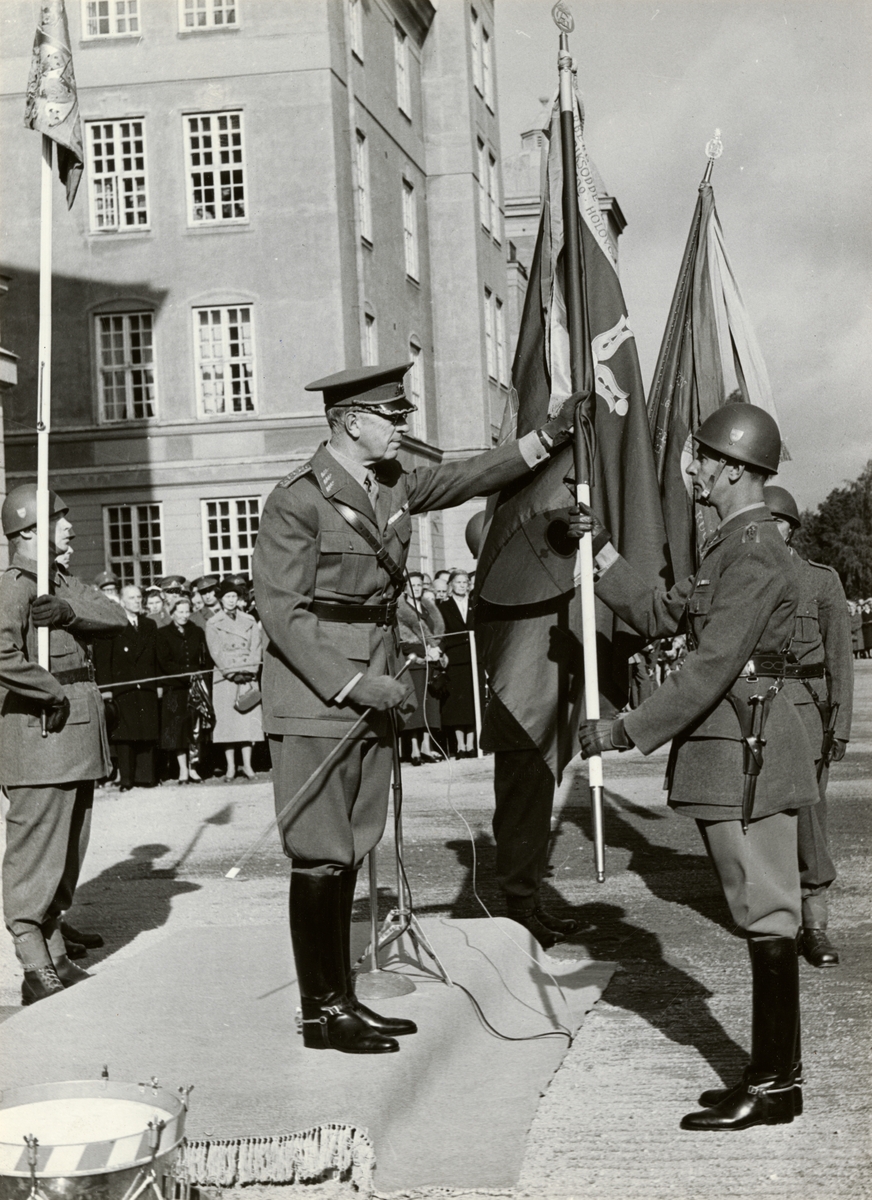 Text i fotoalbum: "Fanöverlämning 27 september 1955. Kapten Kastenholm, överste Grewell."