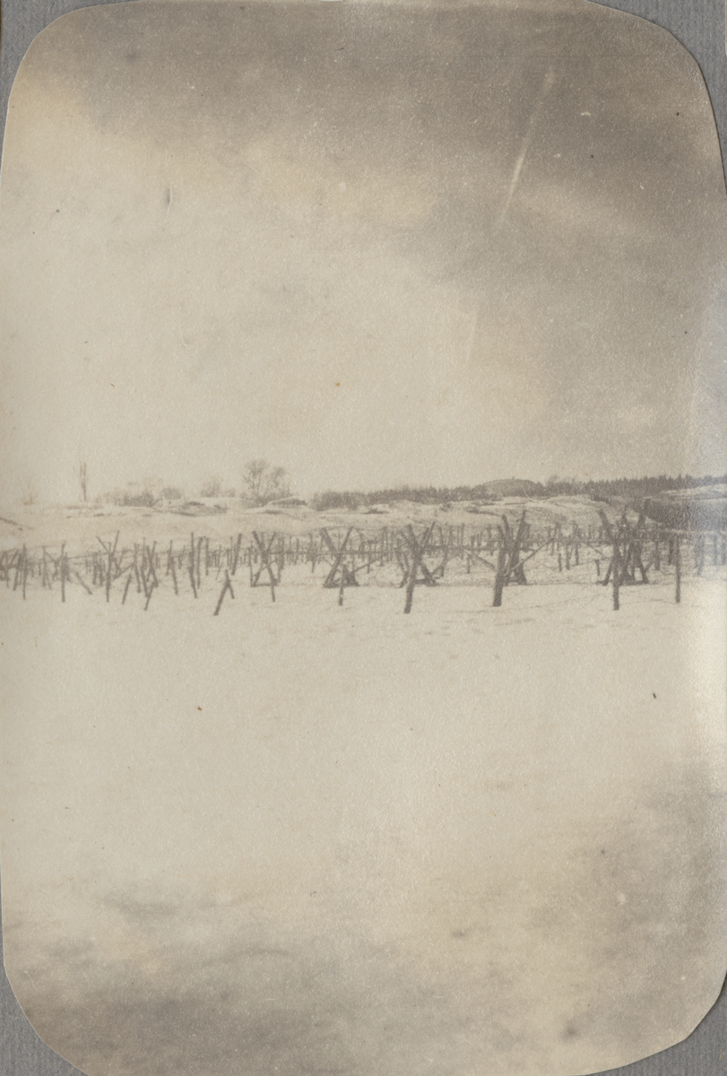 Text i fotoalbum: "Januari 1917 vid Olai. (Winterschlacht am der Aa med ryska tumeld och gasanfall). Se tidningsnotisen "Ett ryskt gasanfall på Rigafronten". Vår ställning tagen fram ifrån".
