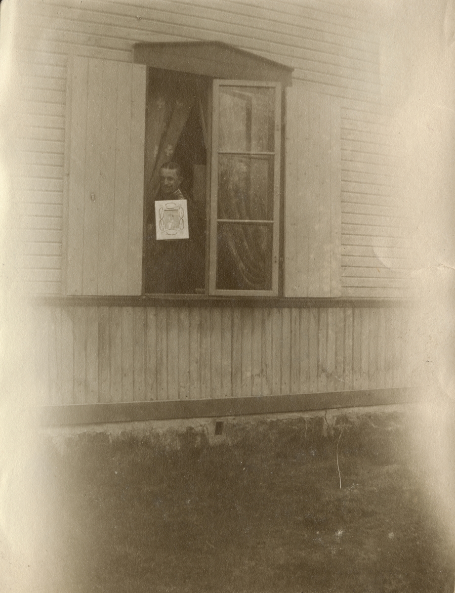 Titel: Text i fotoalbum: "Edgar F. som lycklig fästman 1907 (lilla paviljongen)."