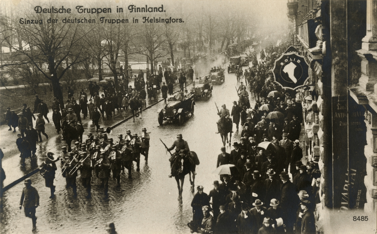 Titel: Text i fotoalbum: "Tyska trupper i Finland. Tyska truppernas inresa till Helsingfors".