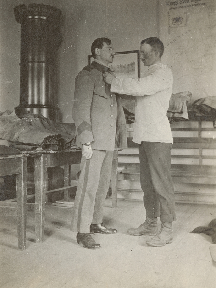 Titel: En soldat får hjälp att klä på sig uniformsrocken.