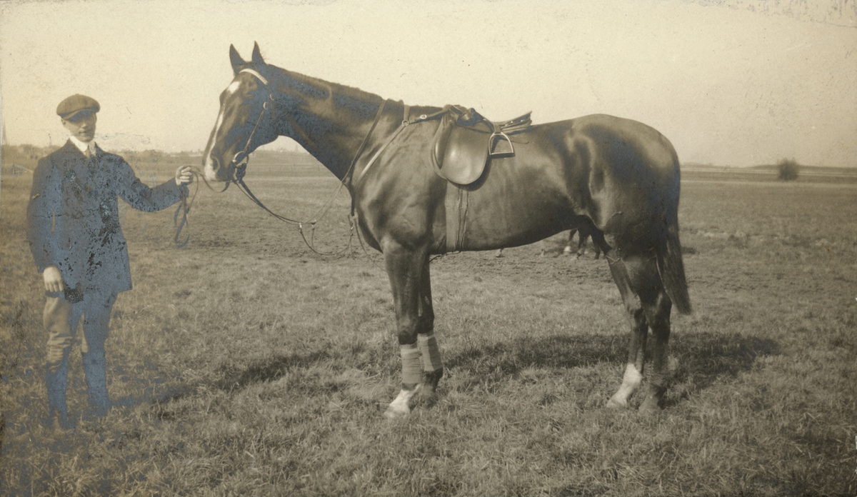 Titel: Text i fotoalbum: "Ränneslätt K 4 Kav. aspirantskola 1900". Man och häst.