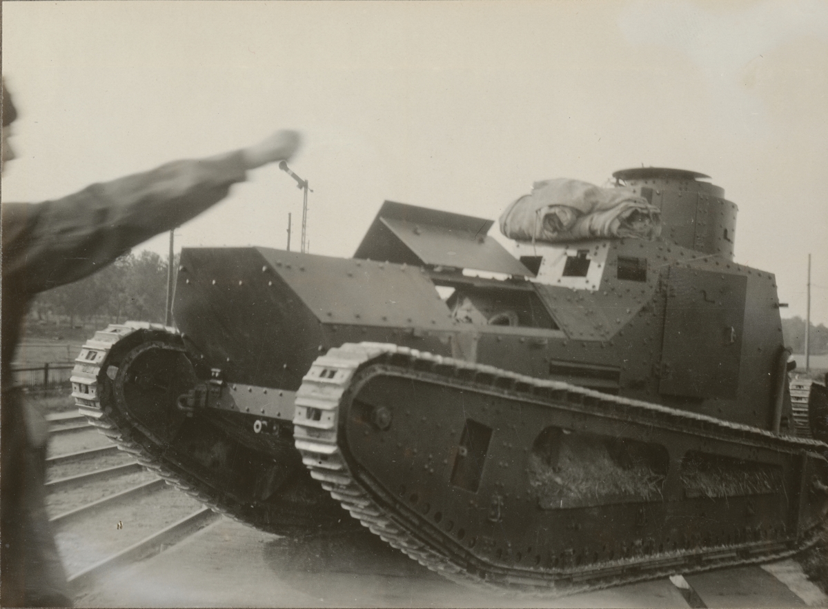 Lastning av stridsvagn m/1921 (eller m/1921-1929) på tåg inför transport till Rosersberg. Göta livgardes stridsvagnsbataljon år 1929.