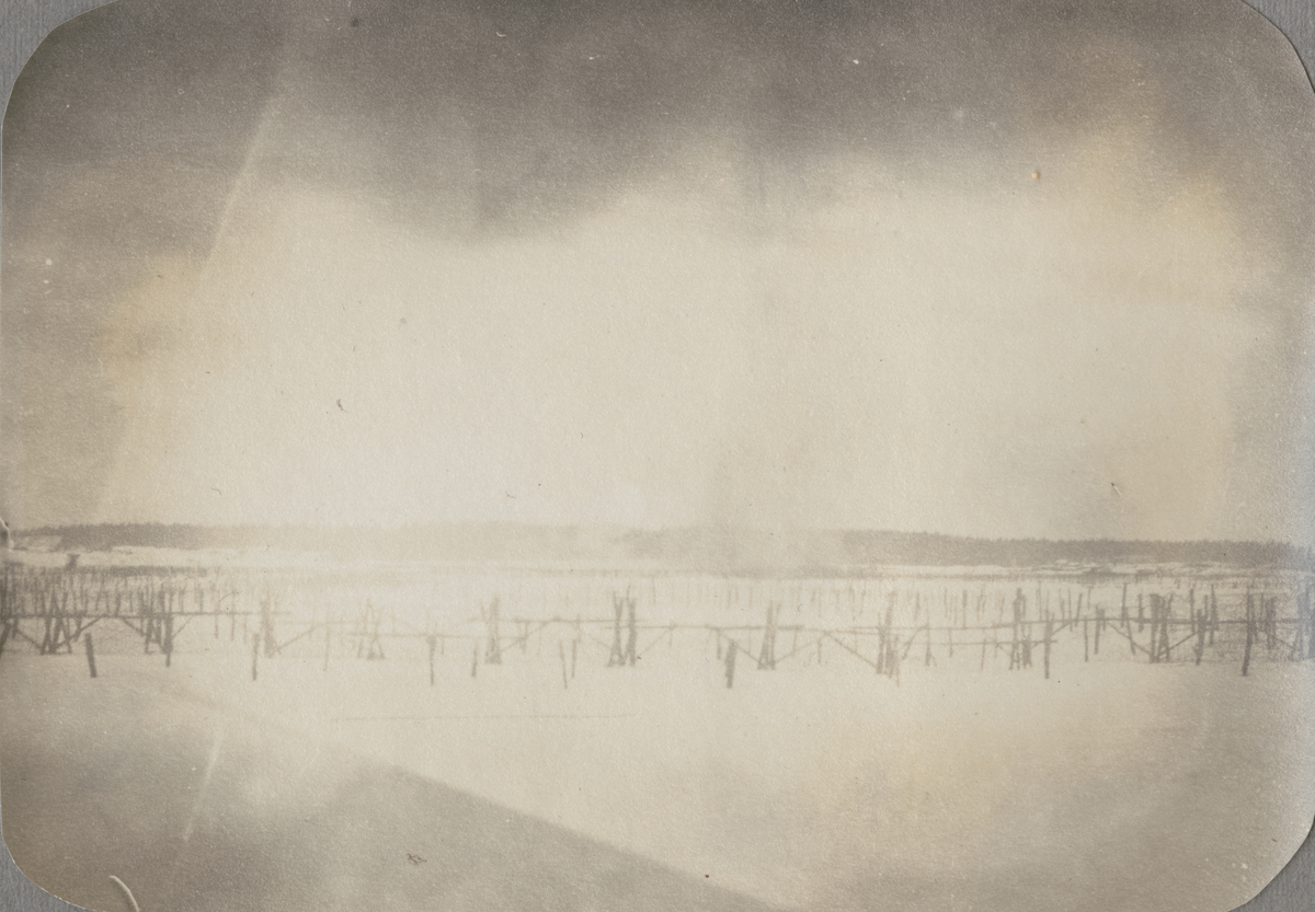 Text i fotoalbum: "Januari 1917. (då vi hade att uthärda svåra ryska anfall, Winterschlacht am der Aa). Olai ställningen. Utblick på ryska ställningen."