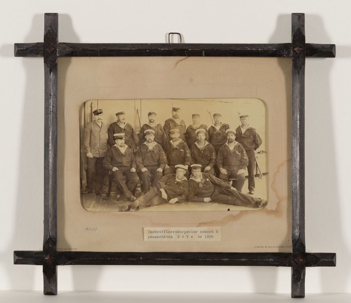 Denna grupporträtt föreställer underofficerskorpraler ombord på pansarbåten Göta 1896.