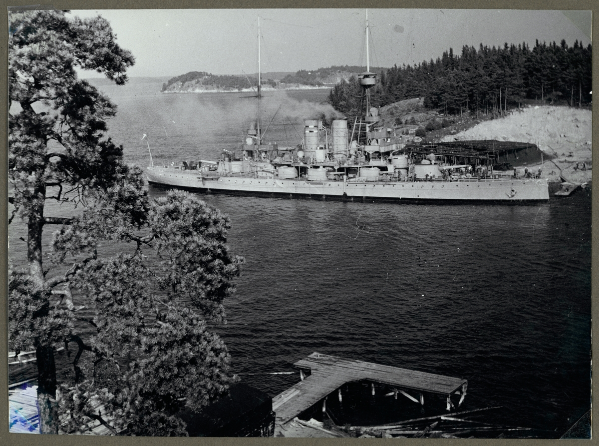Titel: Pansarskeppt Manligheten ligger förtöjt vid en ö i skärgården.