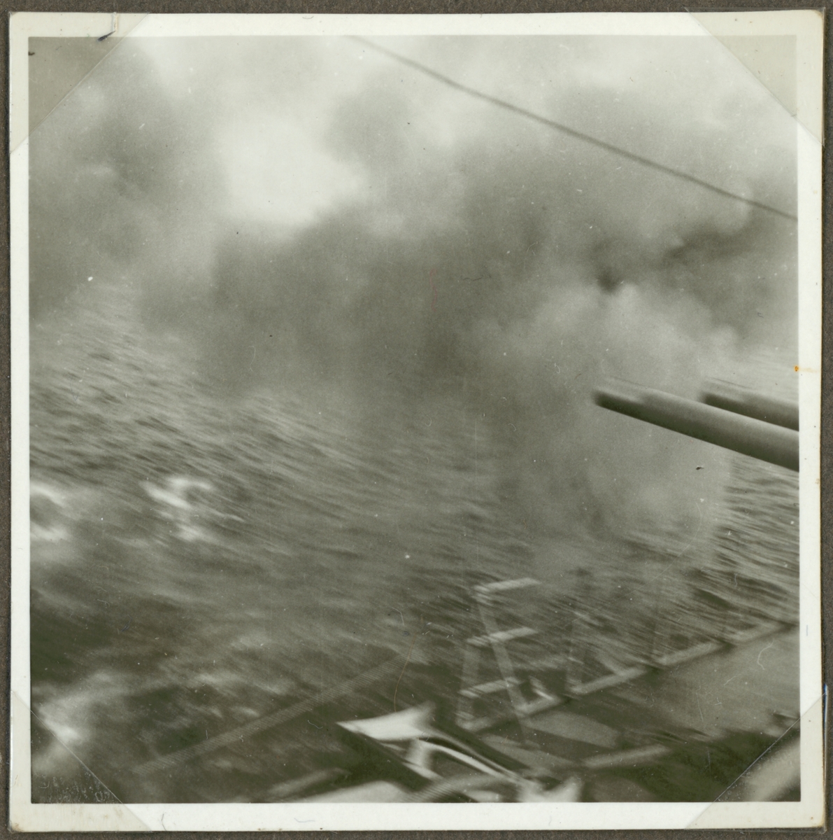 Titel: Denna oskarpa fotografi visar kanoner på ett örlogsfartyg som precist har avlossats.