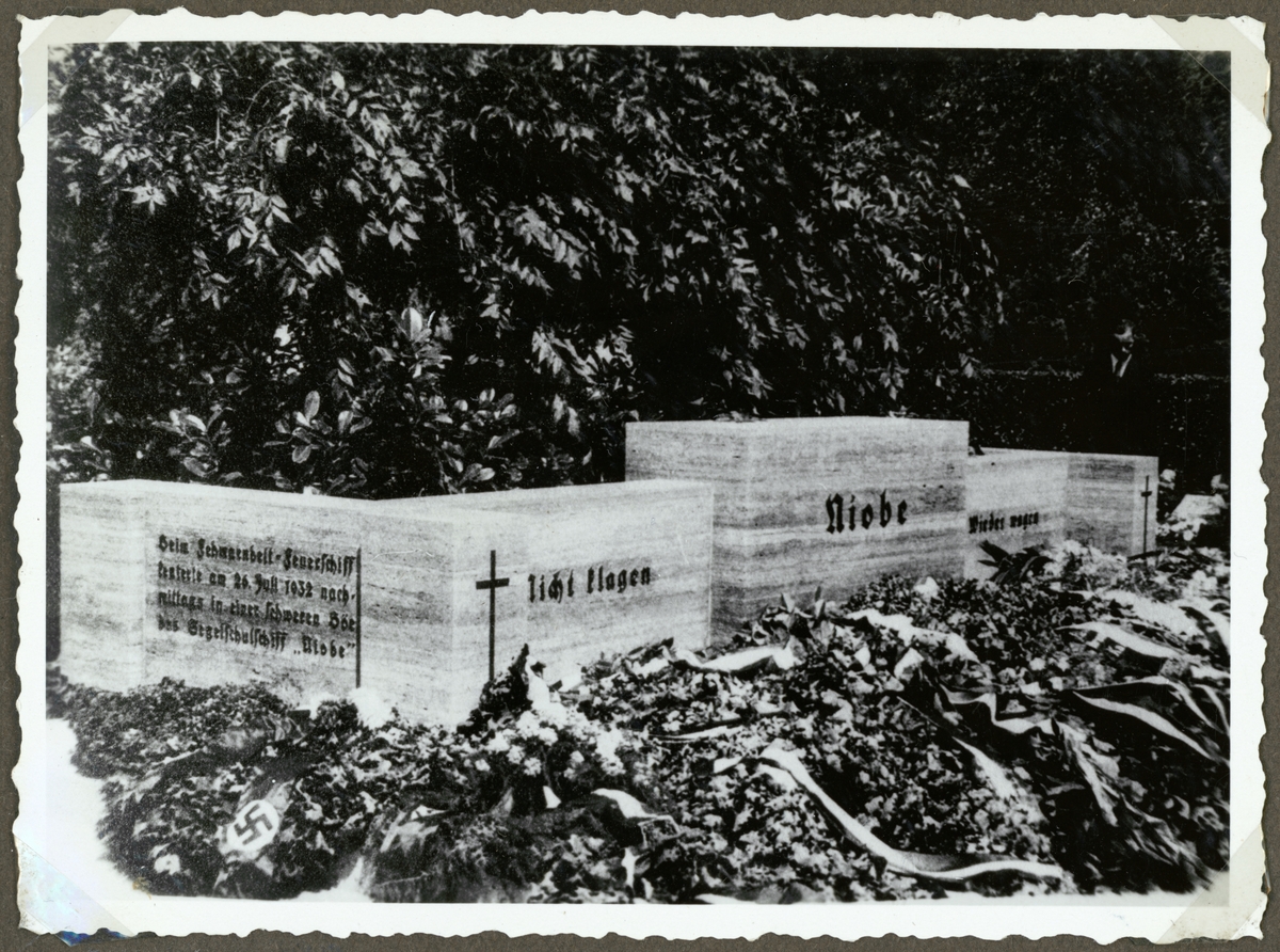 Titel: Bilden visar graven för offren från det tyska skolskeppets Niobes förlisning 1932.