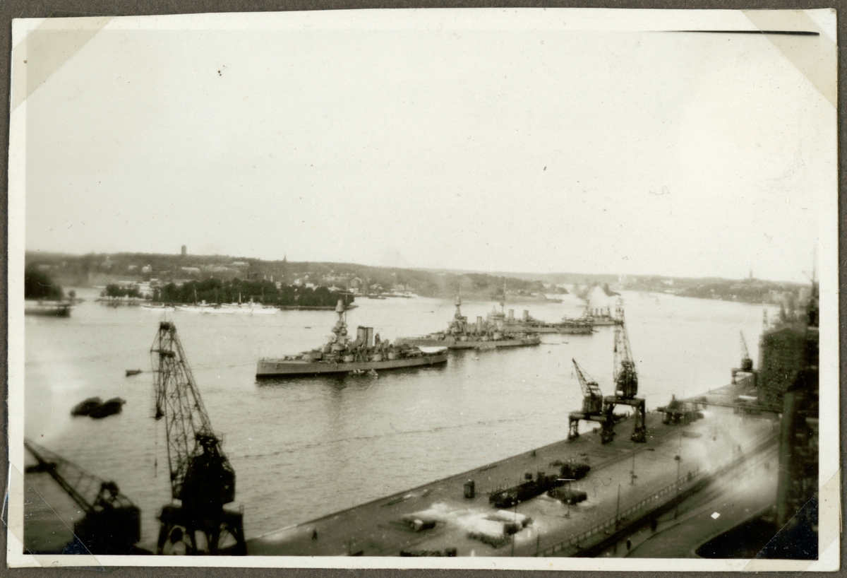 Bilden visar de tre svenska pansarskeppen Sverige, Drottning Victoria, Oscar II och flygplanskryssaren Gotland på Strömmen i Stockholm.