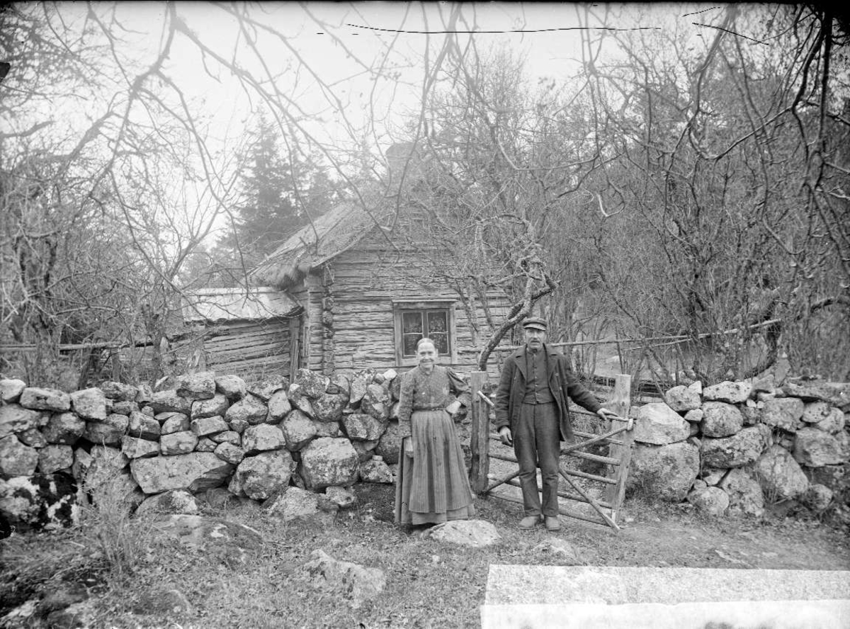 Lotta och August Bjuv framför soldattorpet i Åkerby, Funbo socken, Uppland