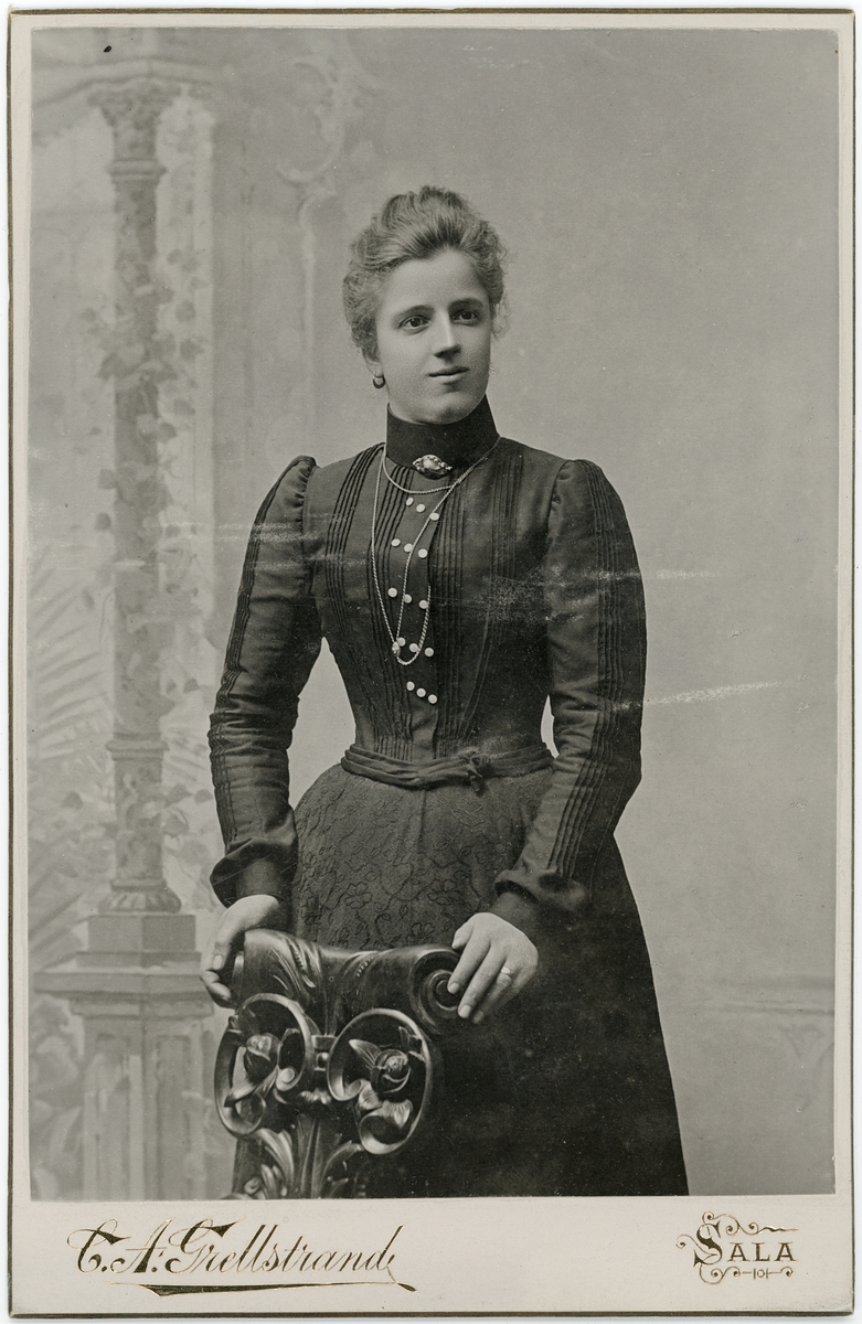 Kabinettsfotografi - kvinna står vid stol, Sala