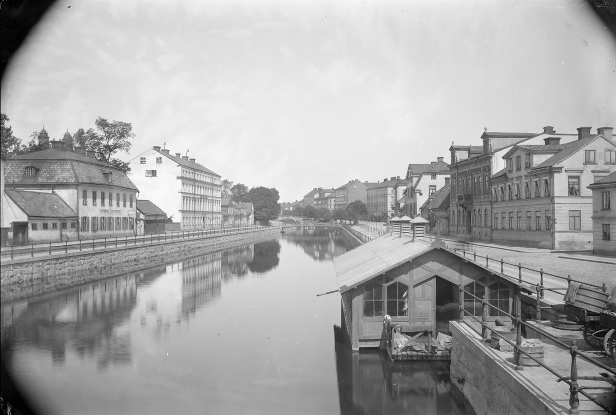 Västra Ågatan, Fyrisån och Östra Ågatan från Islandsbron, Uppsala 1886