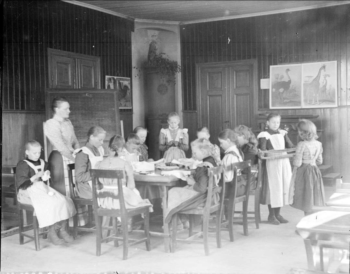 Titel: Syslöjd med lärarinnan Eva Nilsson, eventuellt i Funbo kyrkskola, Funbo socken, Uppland.