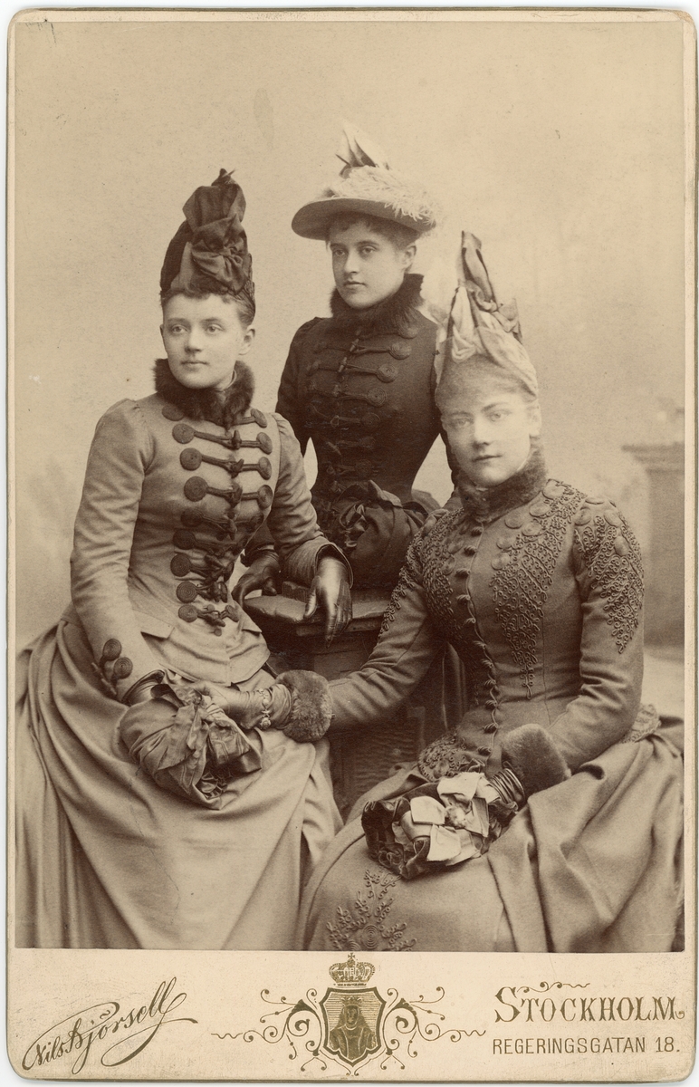Kabinettsfotografi - Elisabeth Ahlnander, Selma Ahlnander och Emmy Engeström klädda i ytterkläder, Stockholm 1890-tal