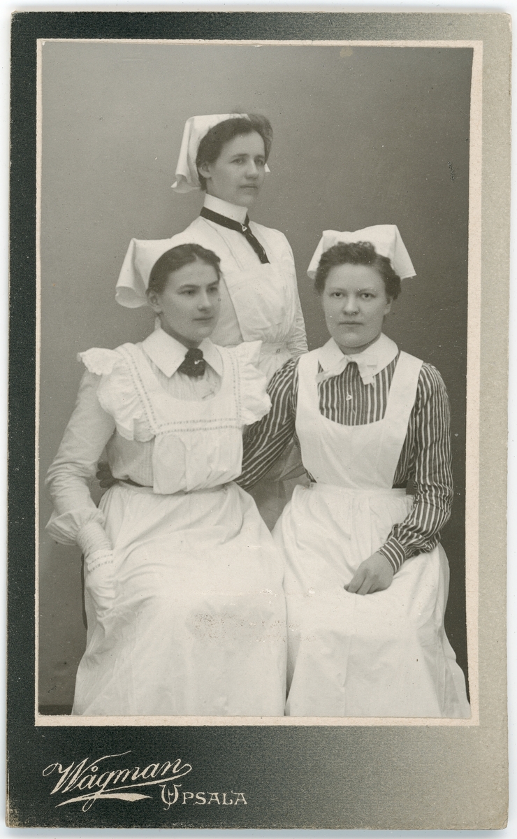 Kabinettsfotografi - tre kvinnor i förkläde och huckle, Uppsala