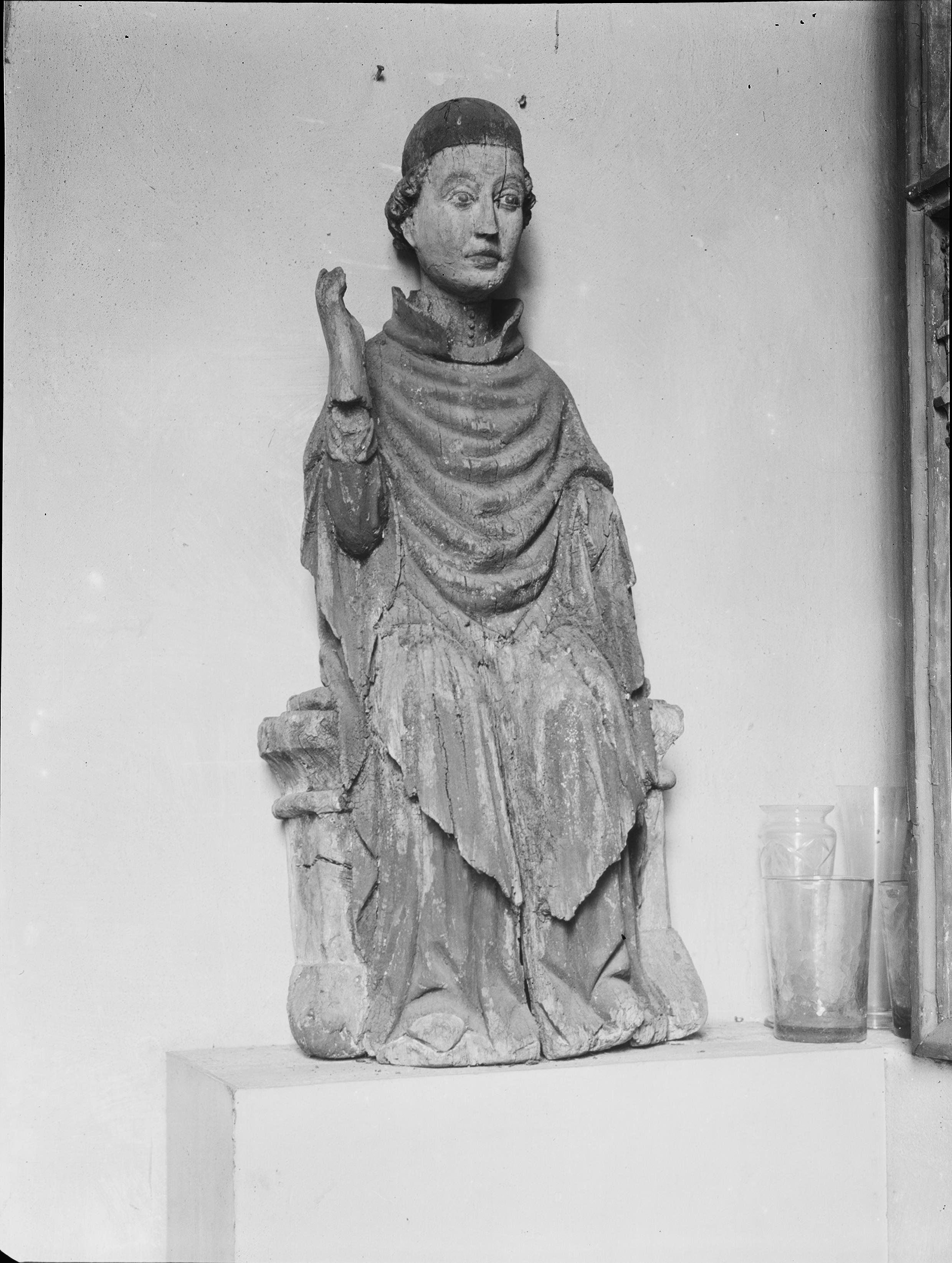 Skulptur av helig biskop, möjligen föreställande Sankt Martin, trä, omkring 1430.