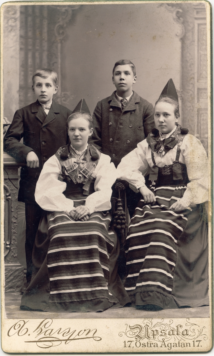 Kabinettsfotografi - två pojkar som står bakom två flickor som sitter