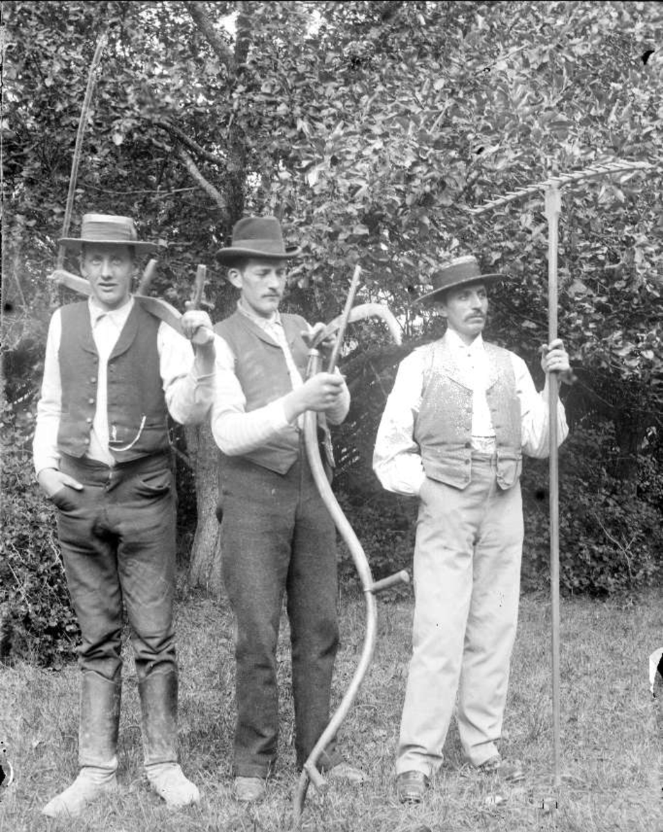 Män med liar och räfsa, Björklinge eller Funbo socken, Uppland