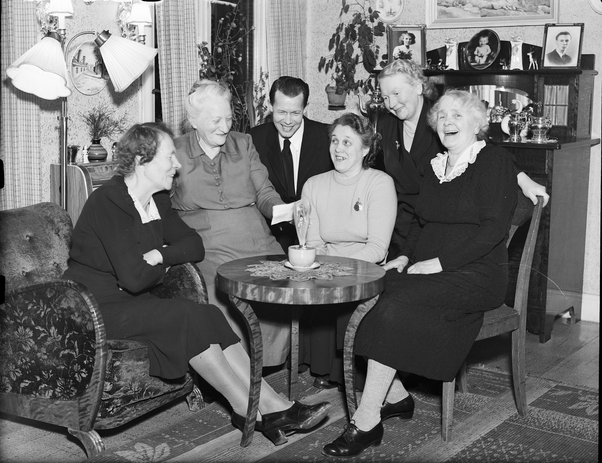 En man och fem kvinnor runt ett bord, Östhammar, Uppland