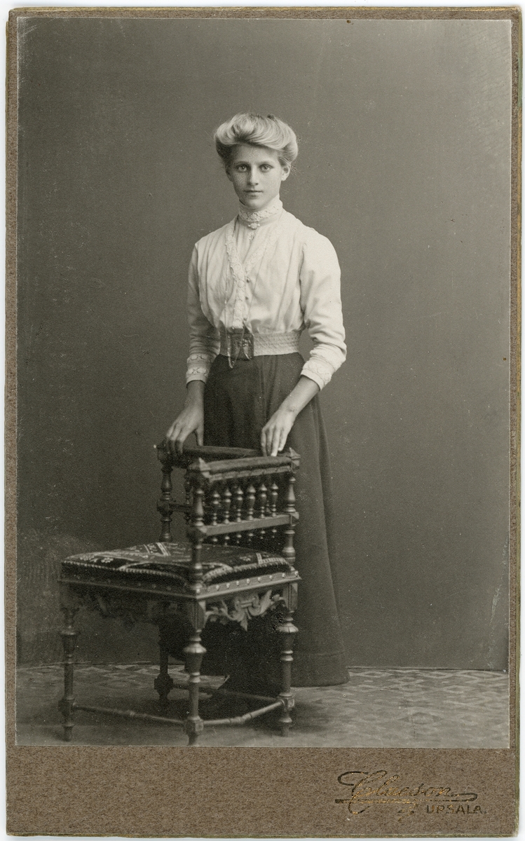 Kabinettsfotografi - kvinna står vid stol, Uppsala