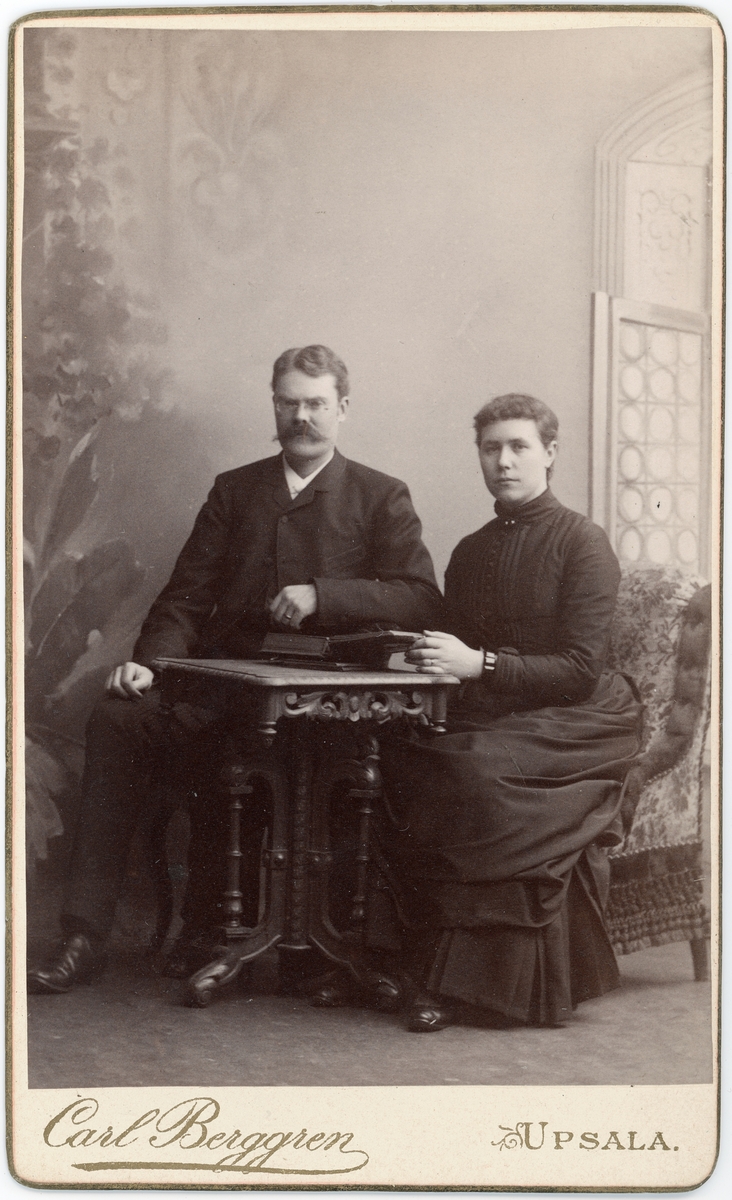 Kabinettsfotografi - man och kvinna sitter vid bord, Uppsala 1888