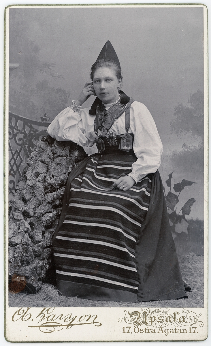 Kabinettsfotografi - kvinna i folkdräkt, Uppsala 1892