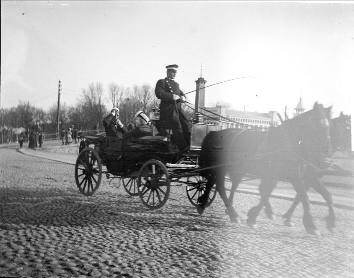Manliga studenter åker häst och vagn med uniformsklädd kusk på Östra Ågatan, Uppsala