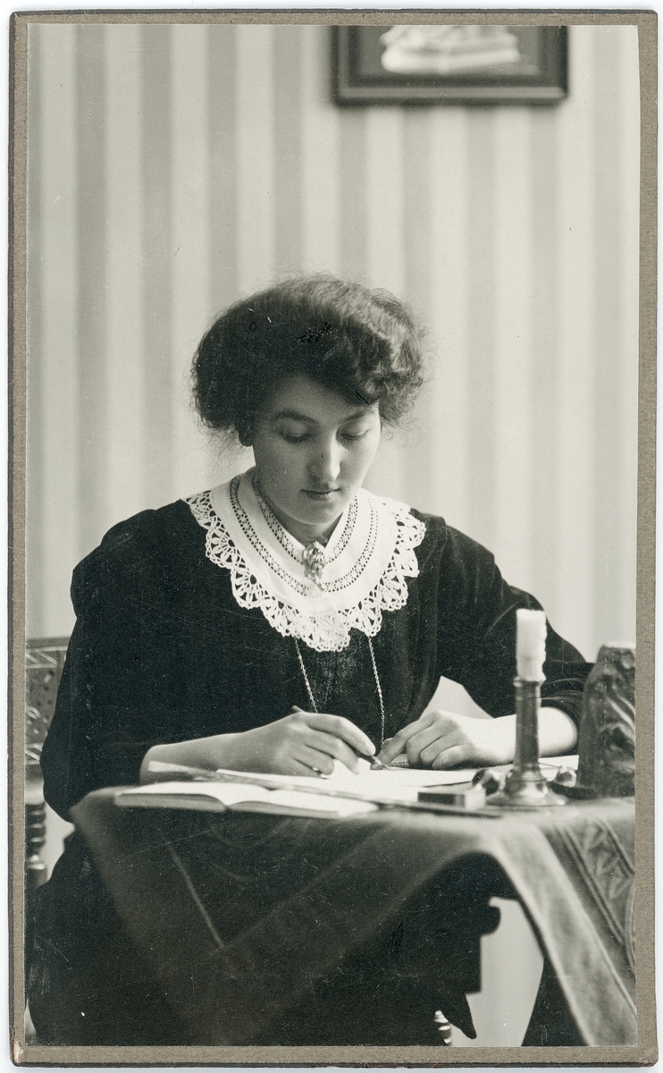 Kabinettsfotografi - en kvinna sitter vid ett bord och skriver