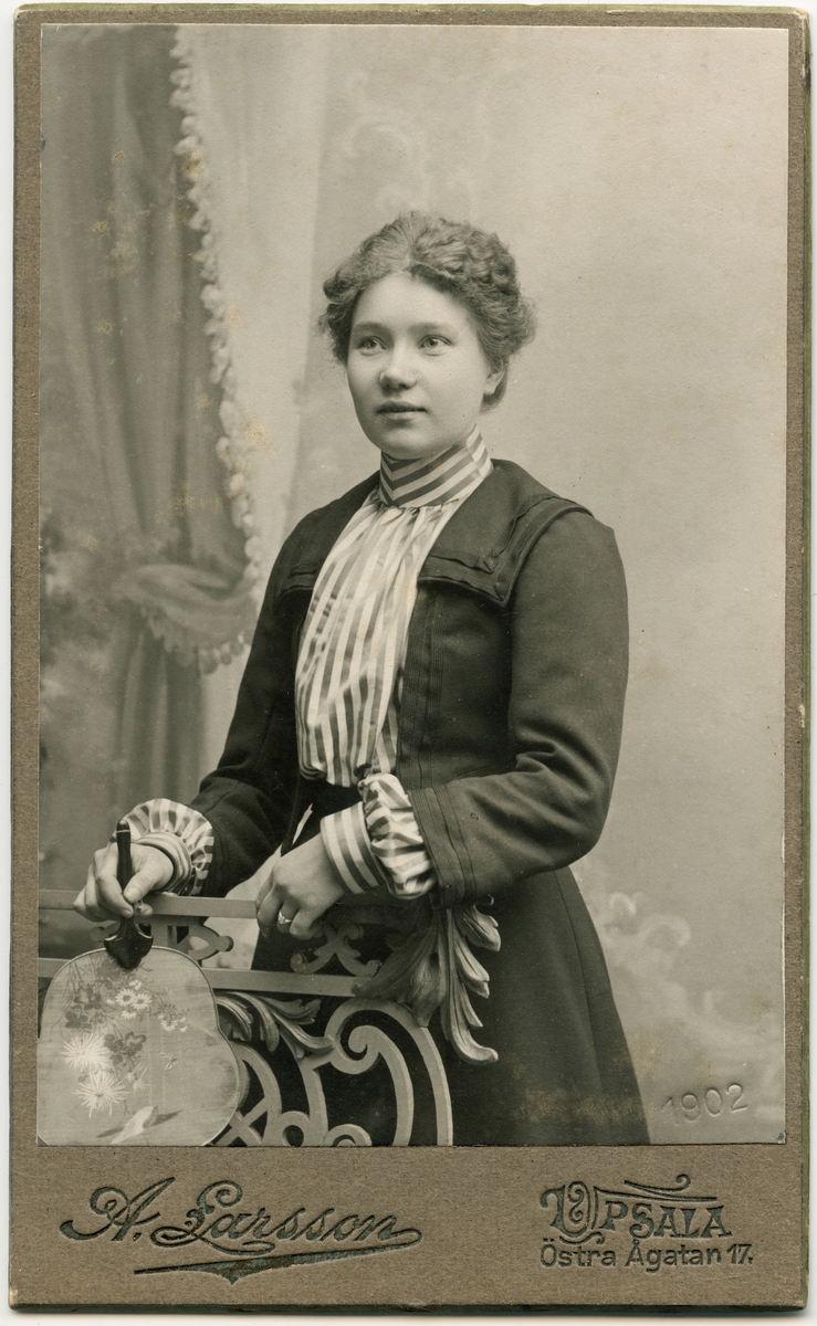 Kabinettsfotografi - kvinna står med en handfläkt i handen, Uppsala 1902