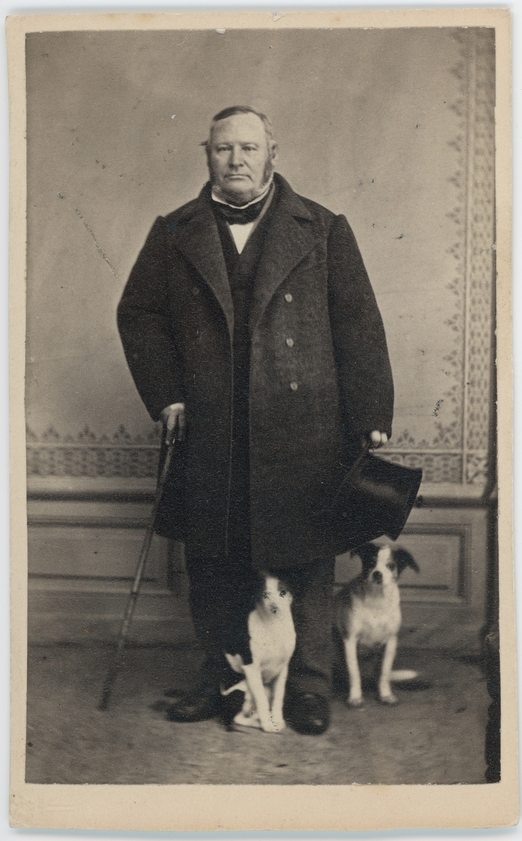 Kabinettsfotografi - läderhandlare Werdier i överrock, käpp och med hatten i handen, Uppsala 1860-tal