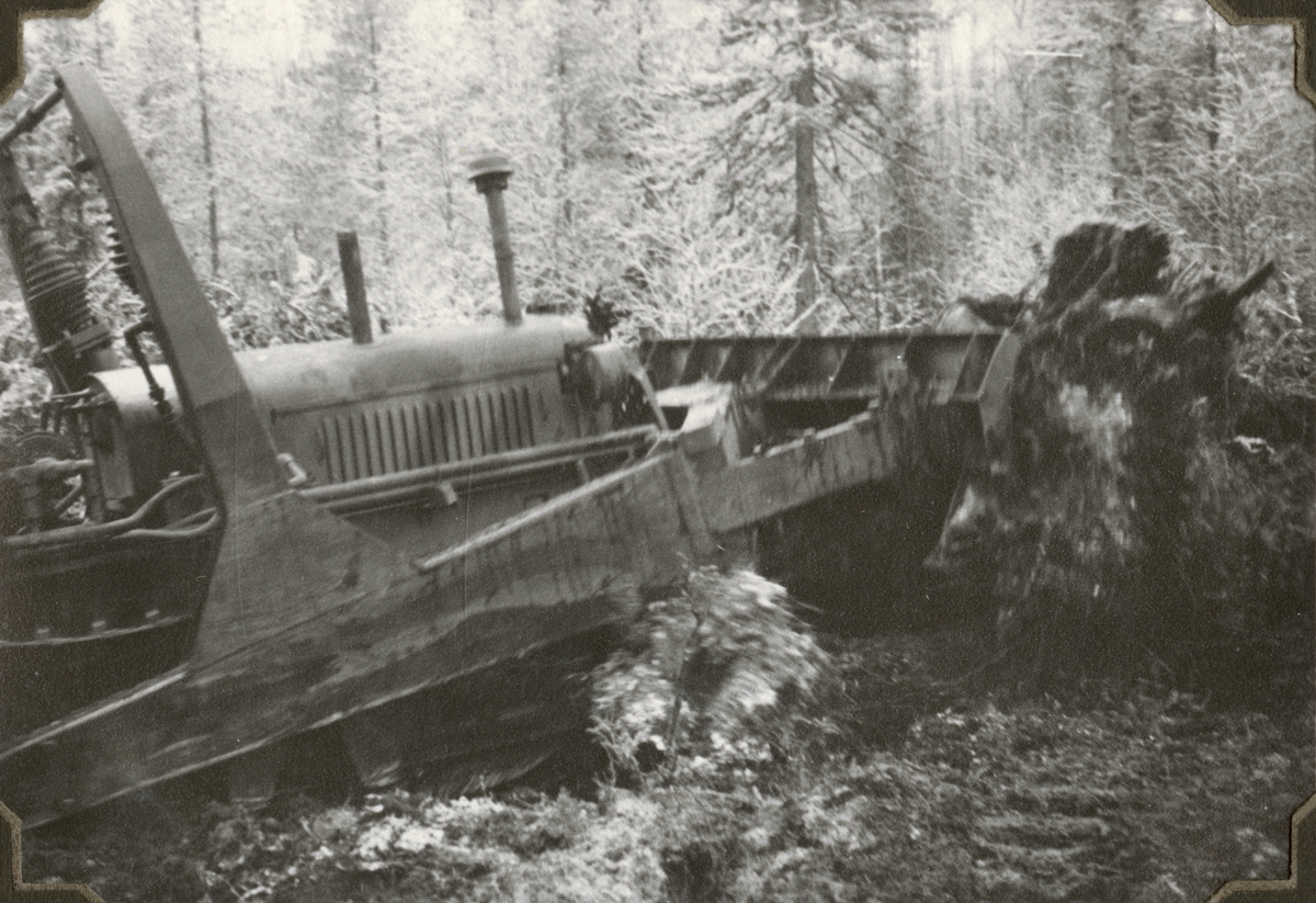 Text i fotoalbum: "Brytning av timmerbasväg med ingbat traktorer nov 1941, Dala-Floda skogar. "