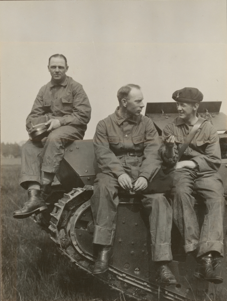 Tre män sittande på stridsvagn m/1921 (eller m/1921-1929). Från vänster: Otto Holmgren Göta livgarde I 2, löjtnant Erik de Maré Dalregementet I 13 och löjtnant Gunnar Asklin Bohusläns regemente I 17. Soldaterna deltog i stridsvagnskursen vid Göta livgardes stridsvagnsbataljon år 1928-1930.