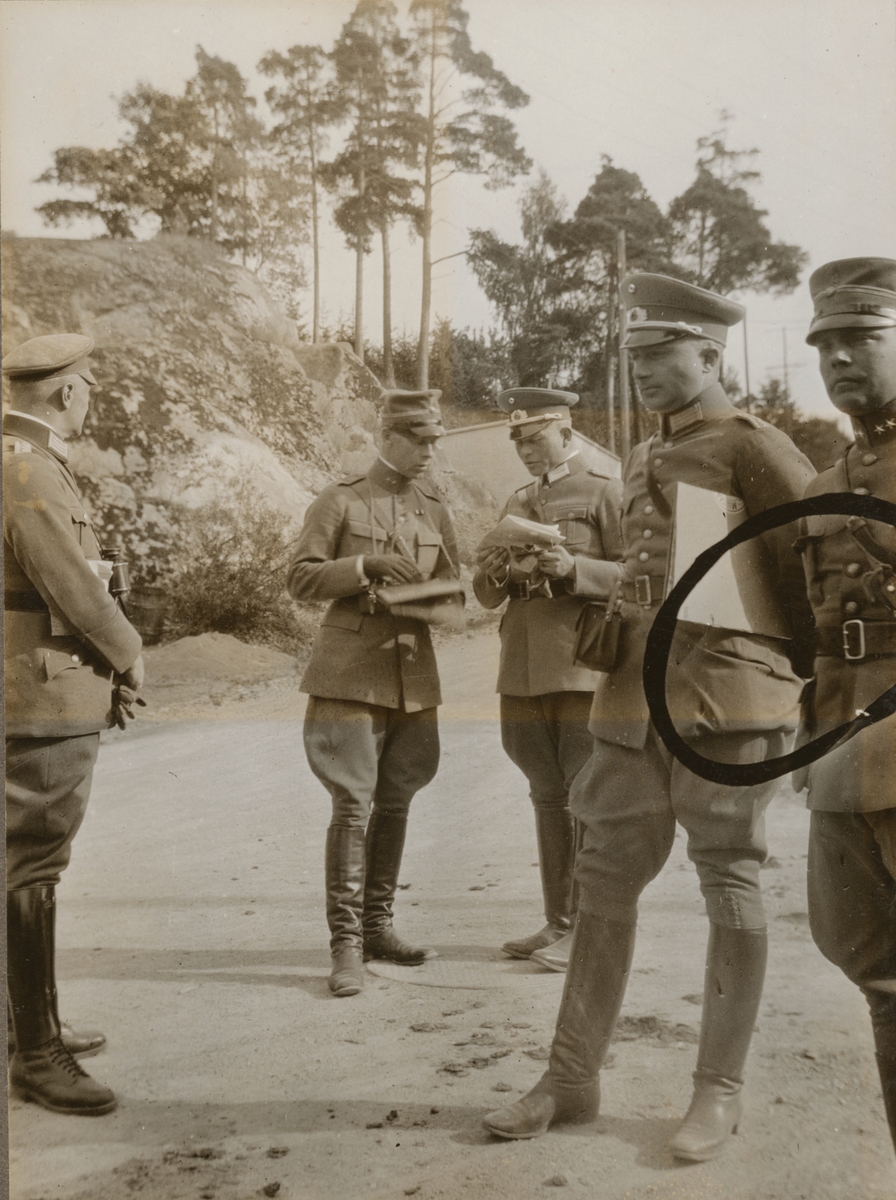 Tyska officerare besöker stridsvagnskursen vid Göta livgardes stridsvagnsbataljon. De informeras här av löjtnant de Maré. Lötjnant Hammarlund till höger.