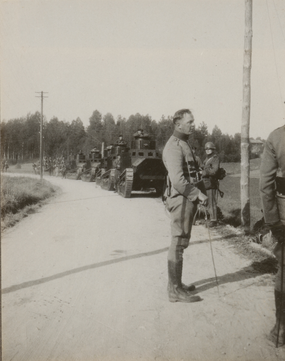 En kolonn av fem stridsvagnar m/1921 (eller 1921-1929) på landsvägen. Närmast kameran löjtnant Otto Holmgren från Göta livgrde I 2.
