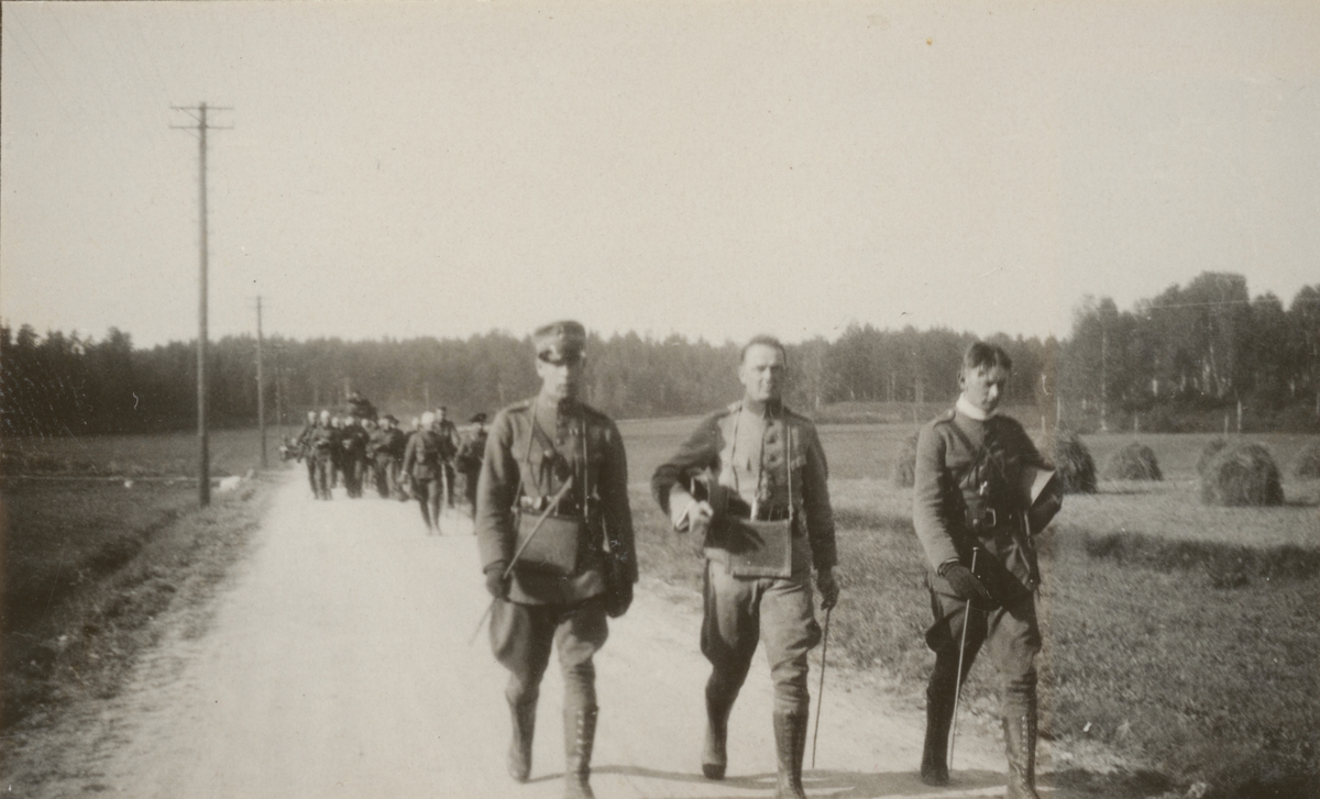 Deltagare i stridsvagnskursen vid Göta livgardes stridsvagnsbataljon marcherar på landsvägen. Närmast kameran (från vänster) löjtnant de Maré Dalregementet I 13, löjtnant Holmgren Göta livgarde I 2 och löjtnant Festin Livregementets grenadjärer I 3.
