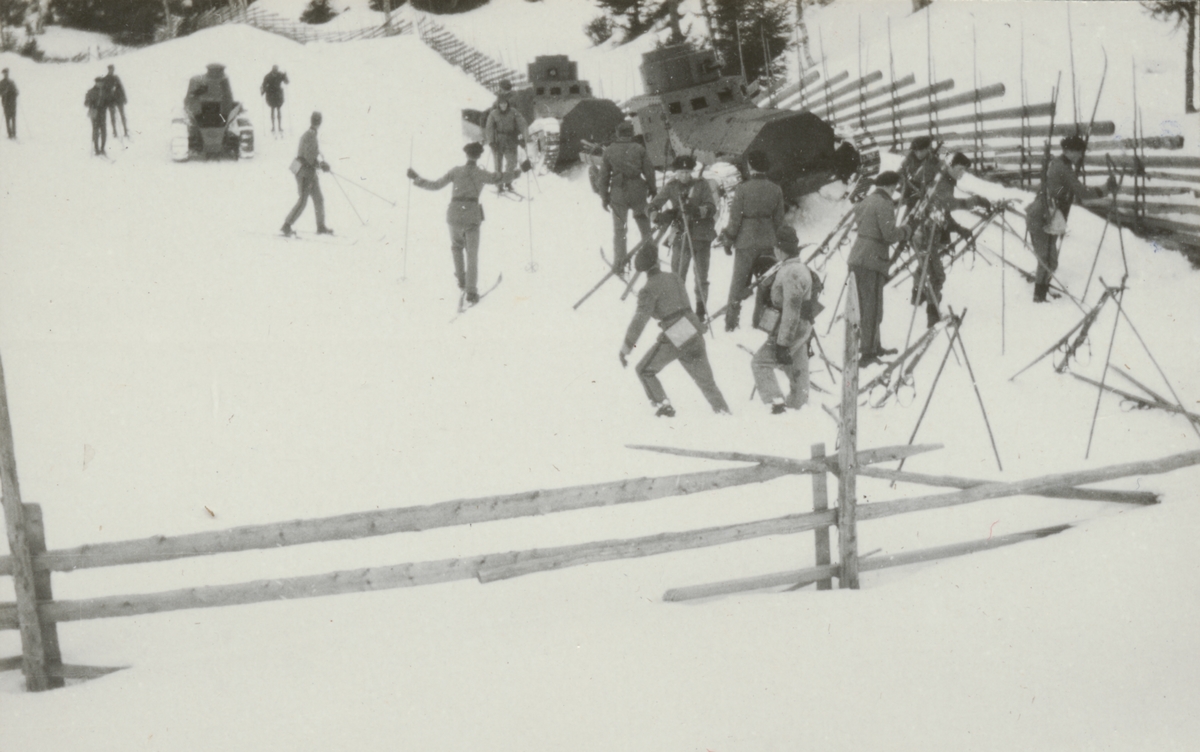 Titel: Tre stridsvagnar m/1921 (eller m/1921-1929) uppe på fjället. Soldater på skidor följer framfarten.