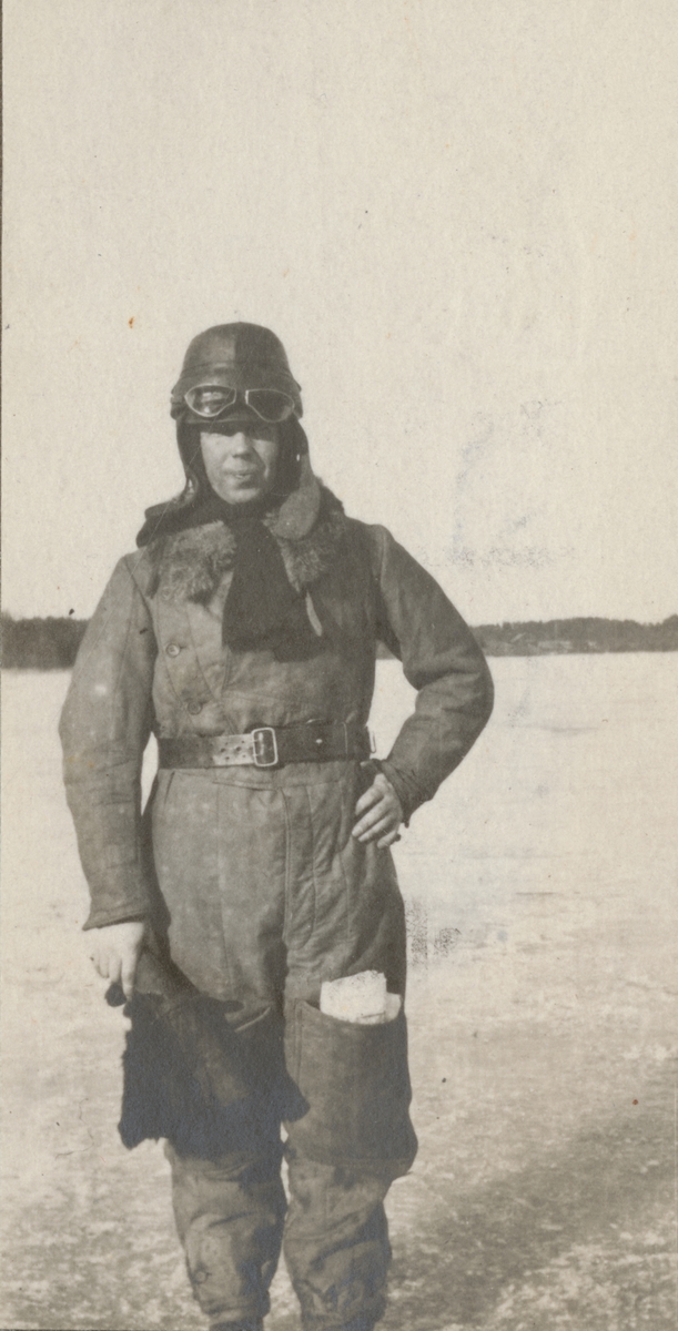 En pilot klädd i flygdräkt, troligen Birger Schyberg.