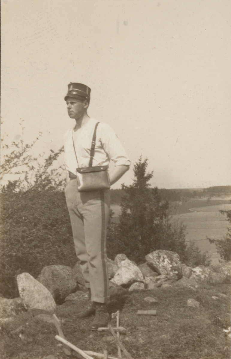 Titel: En soldat från Södermanlands regemente står på en kulle.