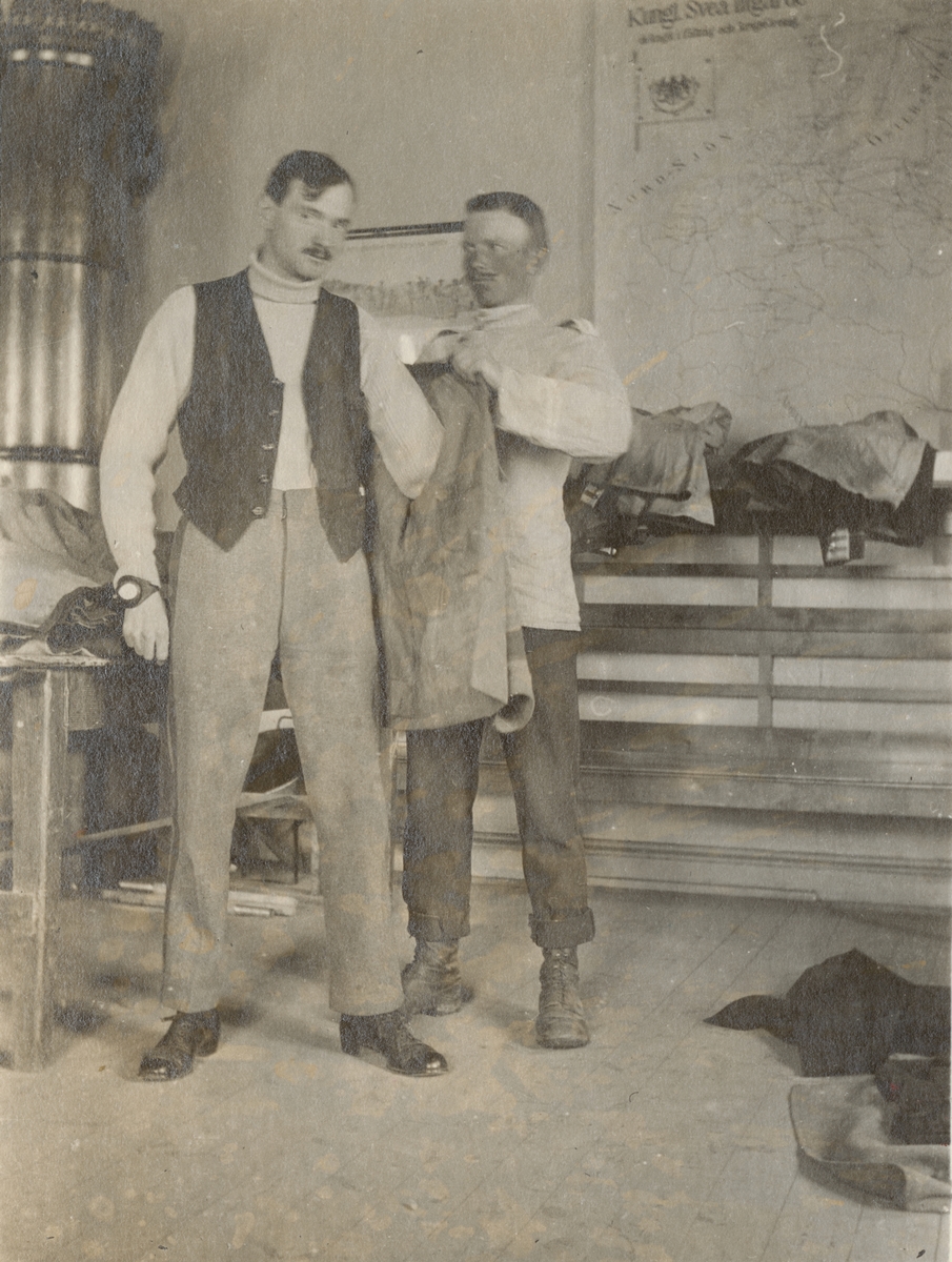Titel: En soldat får hjälp att klä på sig uniformsrocken.