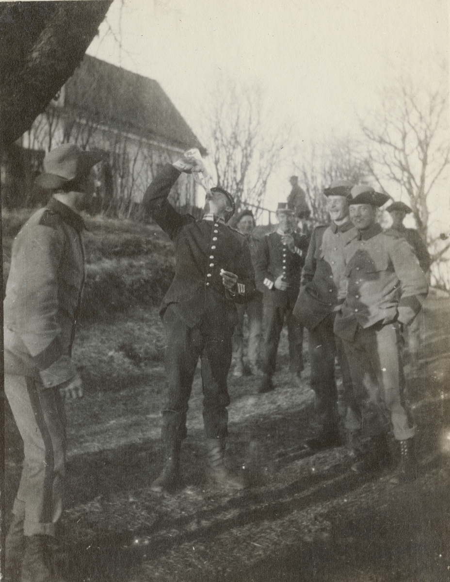 Titel: Soldat från Göta livgarde har drickapaus utomhus. Andra soldater med glada miner står omkring.