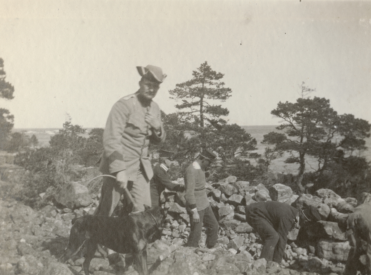 Titel: Officerare från Göta livgarde med sin hund. I bakgrunden soldater i befästningsarbete.