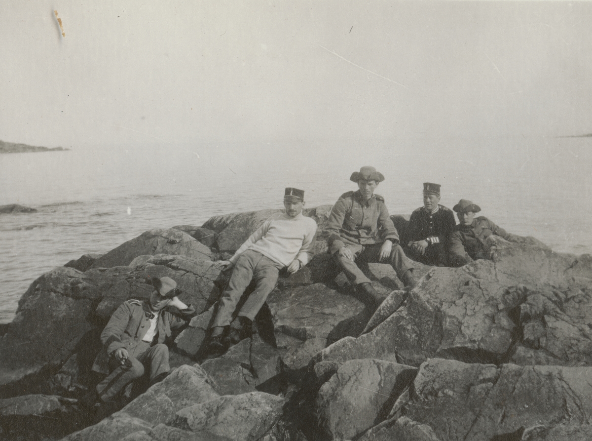 Titel: Gruppbild av soldater från Göta livgarde I 2 på stranden.