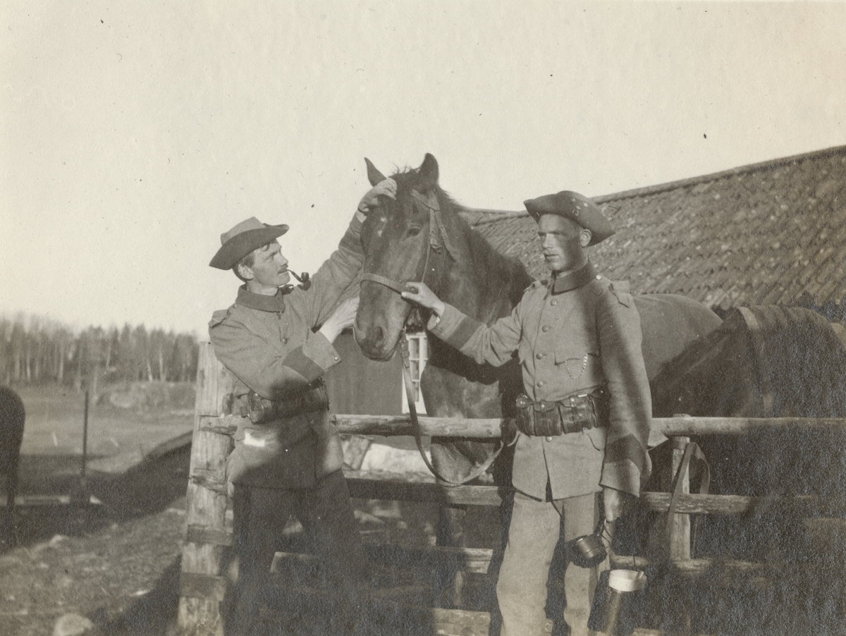 Titel: Två soldater från Göta livgarde I 2 sköter om en häst.