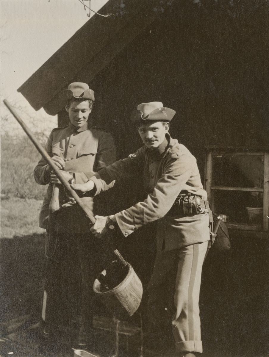 Titel: Två soldater från Göta livgarde I 2 hämtar vatten från en brunn.