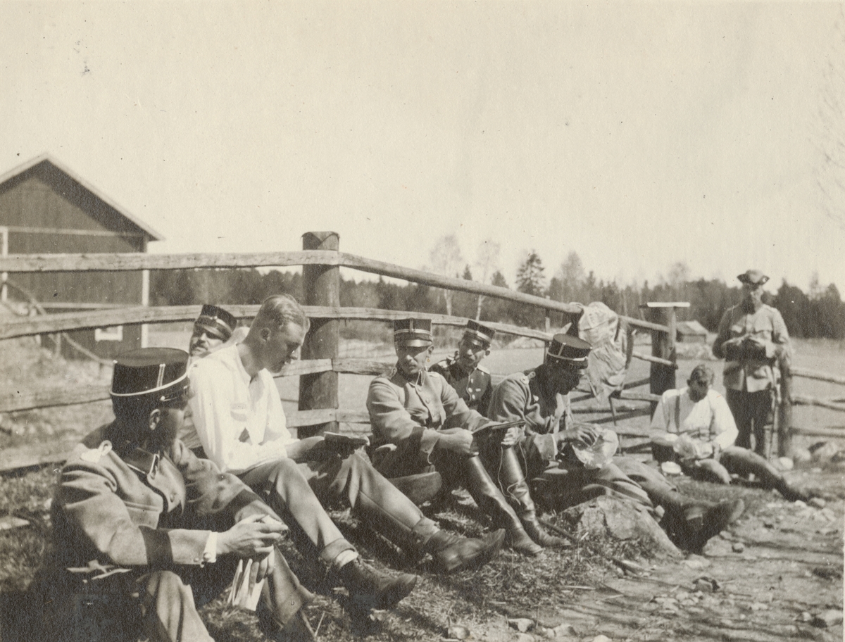 Titel: Soldater från Göta livgarde I 2 har paus framför ett stängsel.