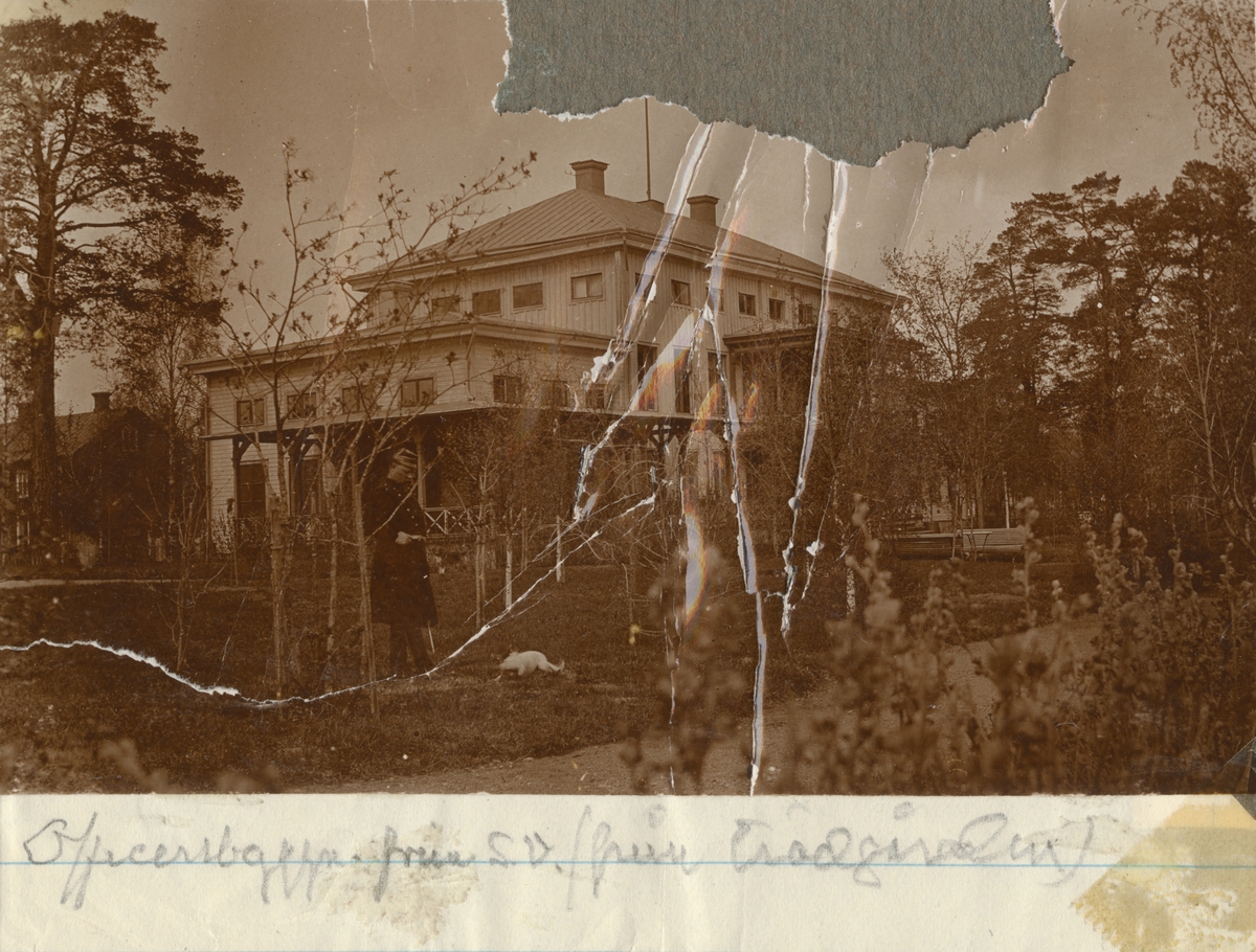Titel: En officerare med hund står i trädgården.