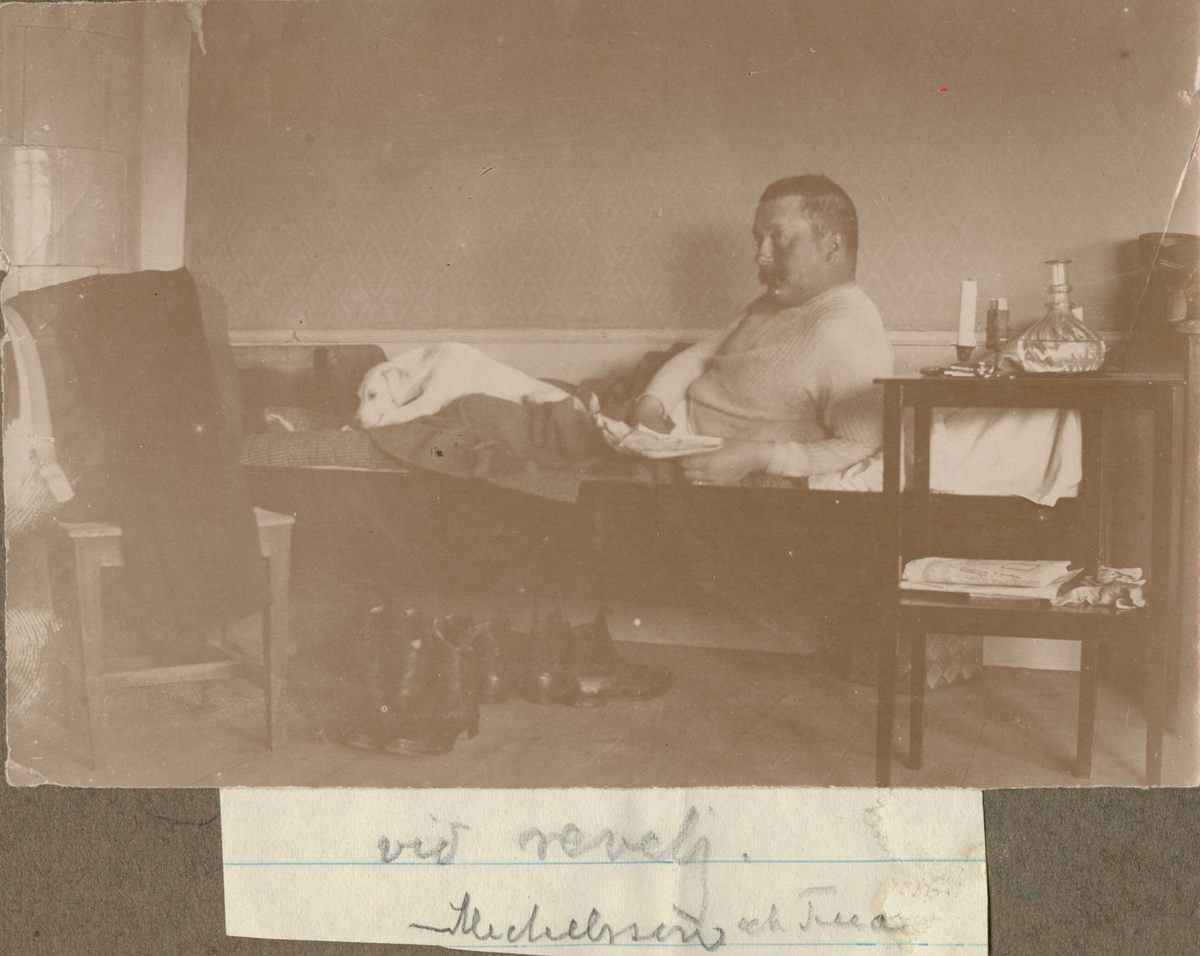 Titel: Morgonväckning. Löjtnant Michelson halvsittande i sin säng med hunden Tua.
